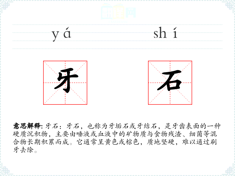 - 词源:牙石一词源自中文,由“牙”和“石”两个字组成,直接反映了其字面意思。