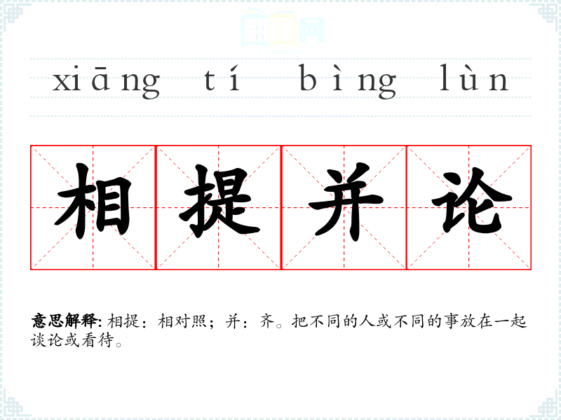 相提:相对照;并:齐。把不同的人或不同的事放在一起谈论或看待。