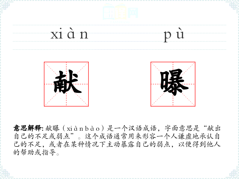 献曝(xiàn bào)是一个汉语成语,字面意思是“献出自己的不足或弱点”。这个成语通常用来形容一个人谦虚地承认自己的不足,或者在某种情况下主动暴露自己的弱点,以便得到他人的帮助或指导。