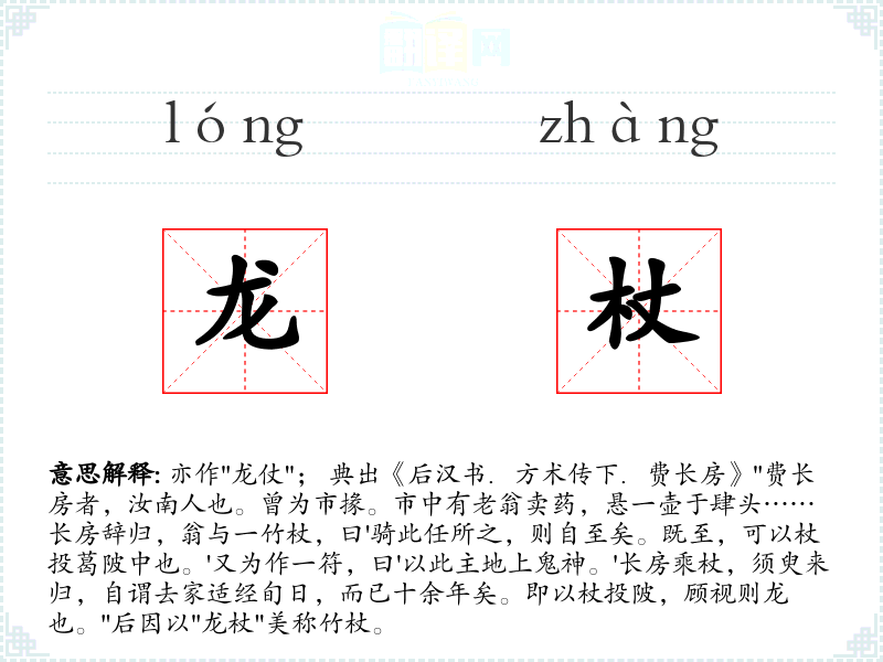 1.亦作"龙仗"; 典出《后汉书.方术传下.费长房》"费长房者,汝南人也。曾为市掾。市中有老翁卖药,悬一壶于肆头……长房辞归,翁与一竹杖,曰'骑此任所之,则自至矣。既至,可以杖投葛陂中也。'又为作一符,曰'以此主地上鬼神。'长房乘杖,须臾来归,自谓去家适经旬日,而已十余年矣。即以杖投陂,顾视则龙也。"后因以"龙杖"美称竹杖。