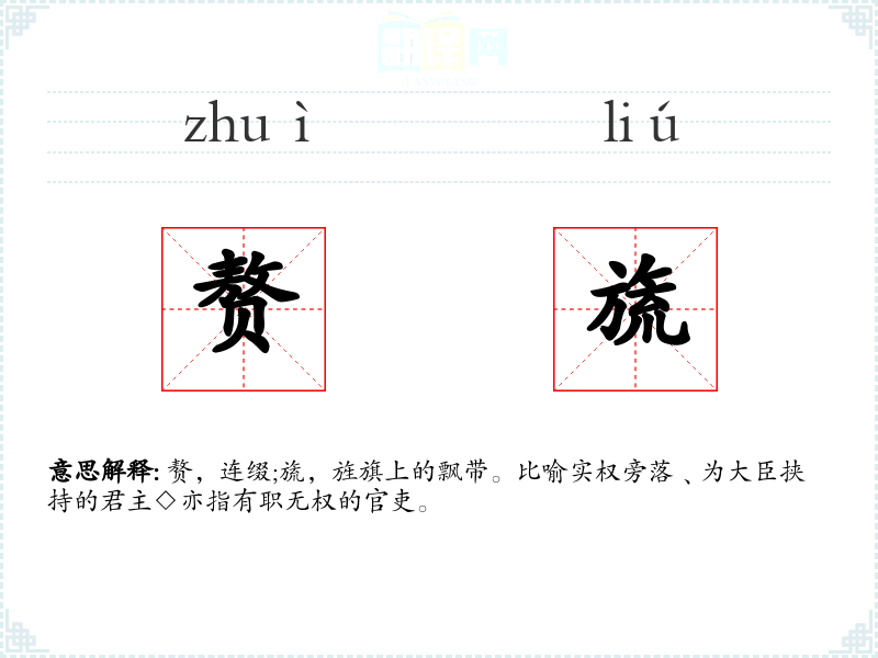 赘,连缀;旒,旌旗上的飘带。比喻实权旁落﹑为大臣挟持的君主◇亦指