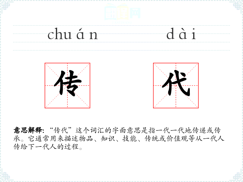“传代”这个词汇的字面意思是指一代一代地传递或传承。它通常用来描述物品、知识、技能、传统或价值观等从一代人传给下一代人的过程。
