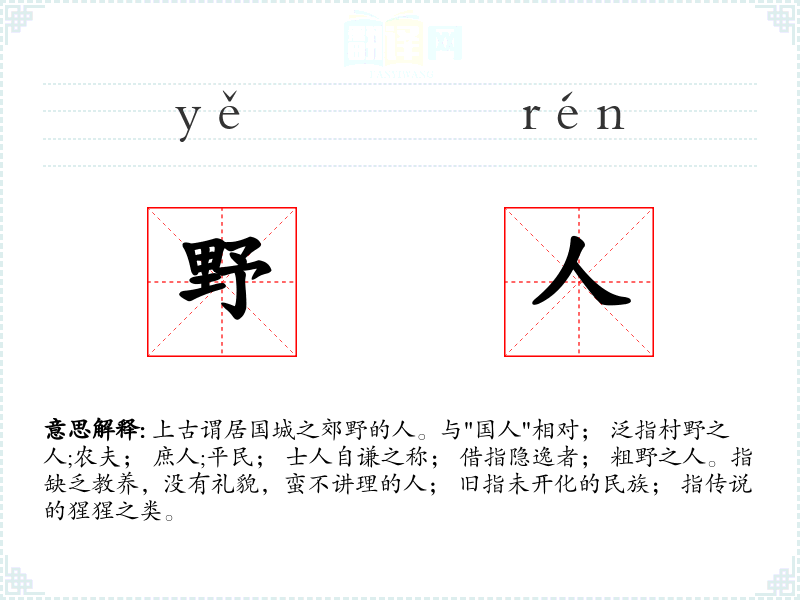 上古谓居国城之郊野的人。与"国人"相对; 泛指村野之人;农夫; 庶人;平民; 士人自谦之称; 借指隐逸者; 粗野之人。指缺乏教养,没有礼貌,