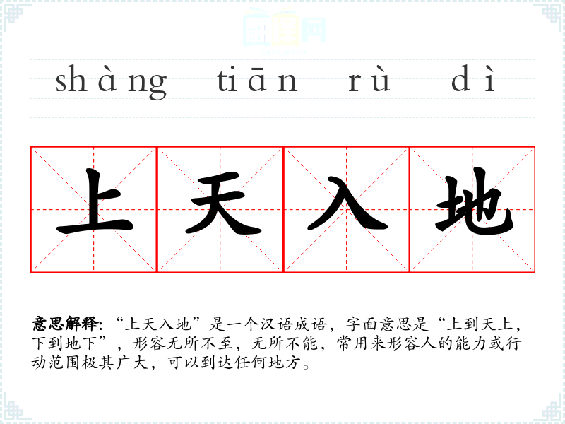 “上天入地”是一个汉语成语,字面意思是“上到天上,下到地下”,形容无所不至,无所不能,常用来形容人的能力或行动范围极其广大,可以到达任何地方。