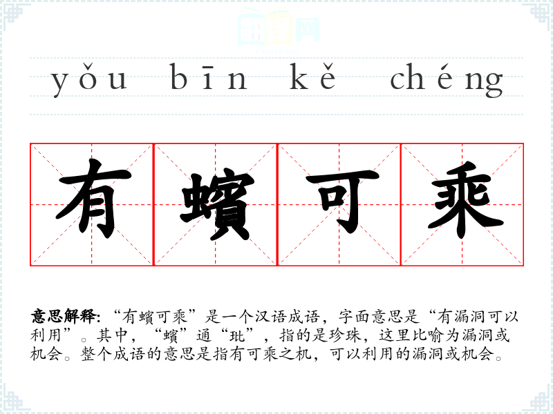 “有蠙可乘”是一个汉语成语,字面意思是“有漏洞可以利用”。其中,“蠙”通“玭”,指的是珍珠,这里比喻为漏洞或机会。整个成语的意思是指有可乘之机,可以利用的漏洞或机会。