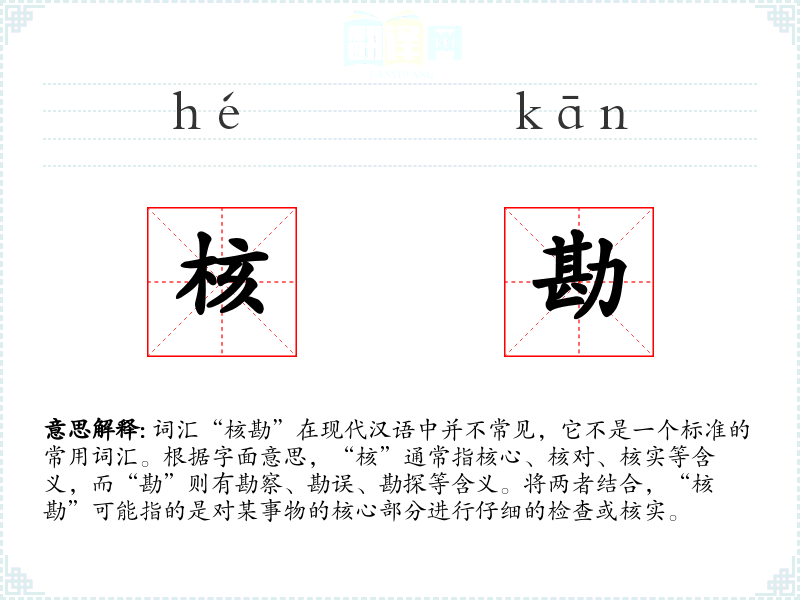 词汇“核勘”在现代汉语中并不常见,它不是一个标准的常用词汇。根据字面意思,“核”通常指核心、核对、核实等含义,而“勘”则有勘察、勘误、勘探等含义。将两者结合,“核勘”可能指的是对某事物的核心部分进行仔细的检查或核实。