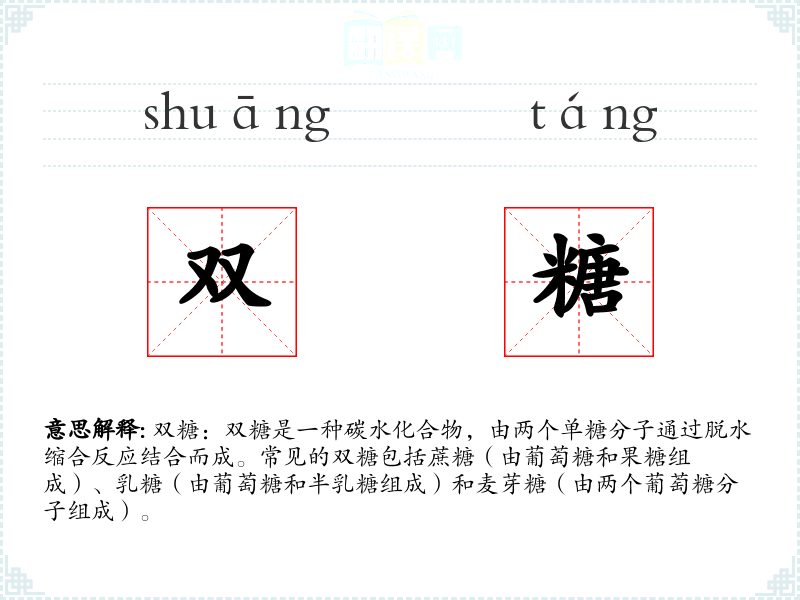 “双糖”一词源于对碳水化合物结构的描述,由“双”(表示两个)和“糖”(表示糖类)组成。在化学和生物学领域,这一词汇一直用于描述由两个单糖分子结合而成的化合物。