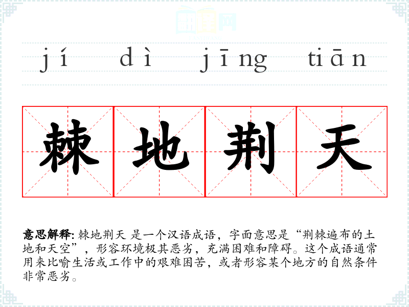 棘地荆天 是一个汉语成语,字面意思是“荆棘遍布的土地和天空”,形容环境极其恶劣,充满困难和障碍。这个成语通常用来比喻生活或工作中的艰难困苦,或者形容某个地方的自然条件非常恶劣。