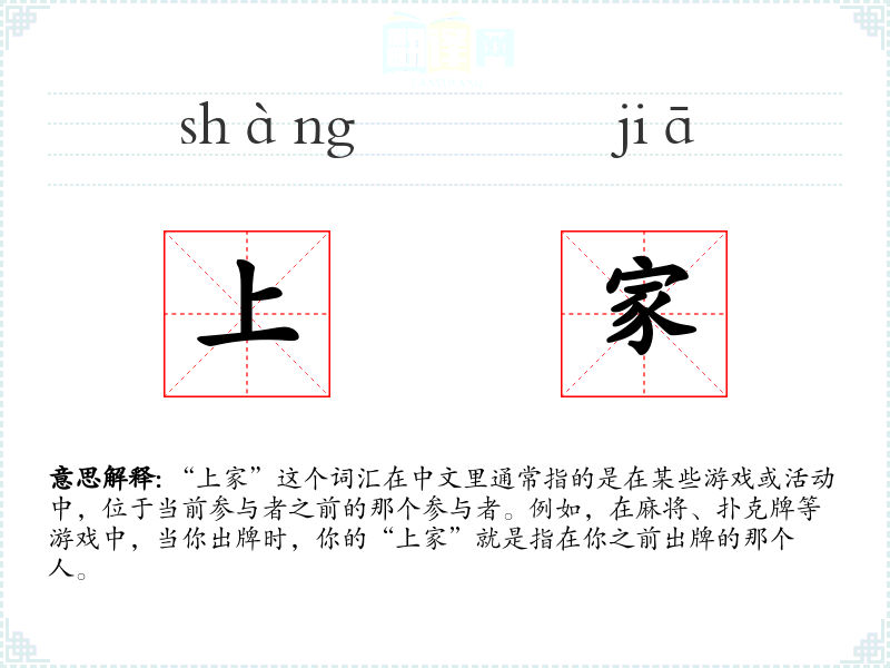 “上家”这个词汇在中文里通常指的是在某些游戏或活动中,位于当前参与者之前的那个参与者。例如,在麻将、扑克牌等游戏中,当你出牌时,你的“上家”就是指在你之前出牌的那个人。