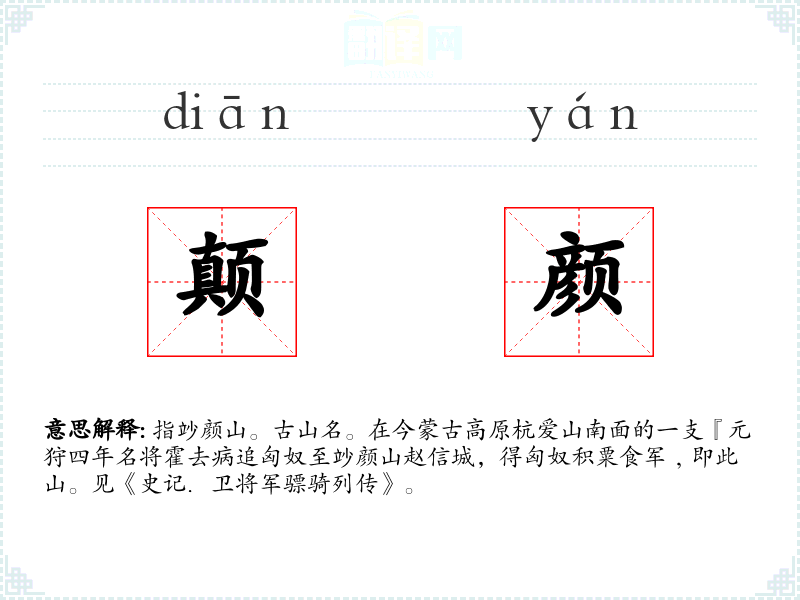 指竗颜山。古山名。在今蒙古高原杭爱山南面的一支『元狩四年名将霍去病追匈奴至竗颜山赵信城,得匈奴积粟食军﹐即此山。见《史记.卫将军骠骑列传》。