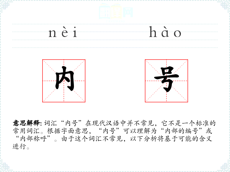 词汇“内号”在现代汉语中并不常见,它不是一个标准的常用词汇。根据字面意思,“内号”可以理解为“内部的编号”或“内部称呼”。由于这个词汇不常见,以下分析将基于可能的含义进行。