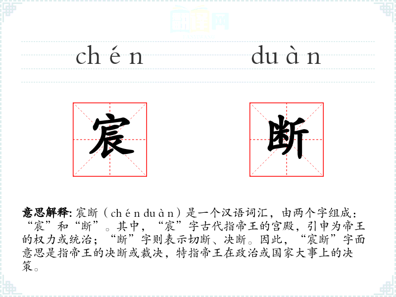 “宸”字源自古代对帝王宫殿的称呼,而“断”字则是一个古老的汉字,表示切断或决断。随着时间的推移,“宸断”逐渐被用来特指帝王的决策,尤其是在政治和军事上的重大决策。