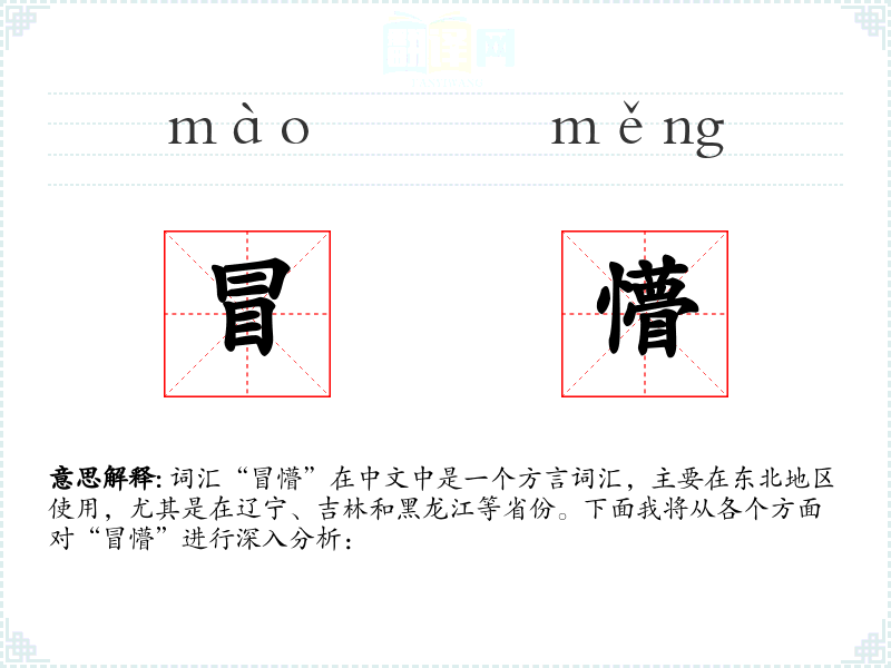词汇“冒懵”在中文中是一个方言词汇,主要在东北地区使用,尤其是在辽宁、吉林和黑龙江等省份。下面我将从各个方面对“冒懵”进行深入分析: