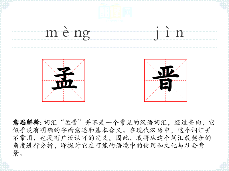 由于“孟晋”不是一个标准词汇,我们无法提供一个确切的基本定义。它可能是由两个汉字“孟”和“晋”组合而成的,但这种组合在现代汉语中没有特定的含义。