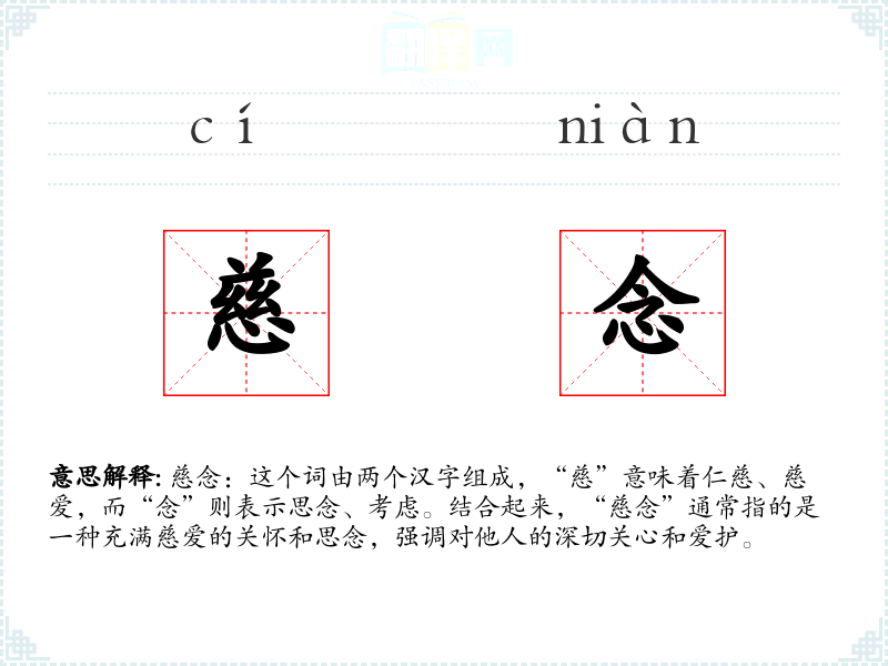 慈念:这个词由两个汉字组成,“慈”意味着仁慈、慈爱,而“念”则表示思念、考虑。结合起来,“慈念”通常指的是一种充满慈爱的关怀和思念,强调对他人的深切关心和爱护。