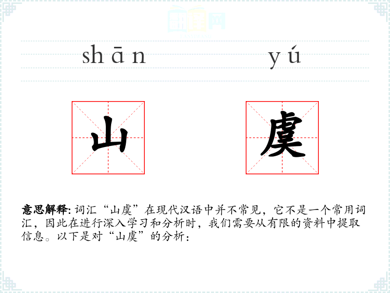 词汇“山虞”在现代汉语中并不常见,它不是一个常用词汇,因此在进行深入学*和分析时,我们需要从有限的资料中提取信息。以下是对“山虞”的分析:
