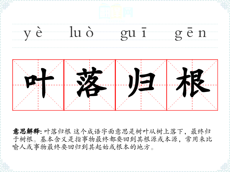 叶落归根 这个成语字面意思是树叶从树上落下,最终归于树根。基本含义是指事物最终都要回到其根源或本源,常用来比喻人或事物最终要回归到其起始或根本的地方。