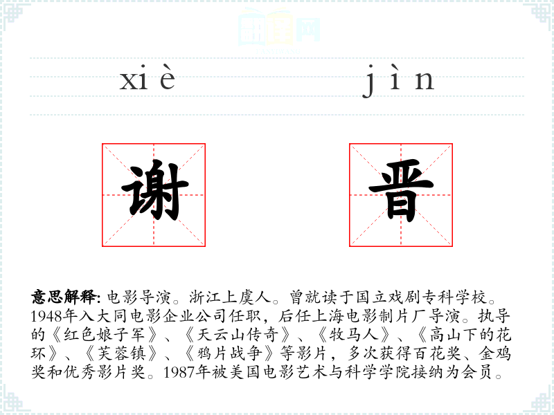 1.电影导演。浙江上虞人。曾就读于国立戏剧专科学校。1948年入大同电影企业公司任职,后任上海电影制片厂导演。执导的《红色娘子军》、《天云山传奇》、《牧马人》、《高山下的花环》、《芙蓉镇》、《鸦片战争》等影片,多次获得百花奖、金鸡奖和优秀影片奖。1987年被美国电影艺术与科学学院接纳为会员。