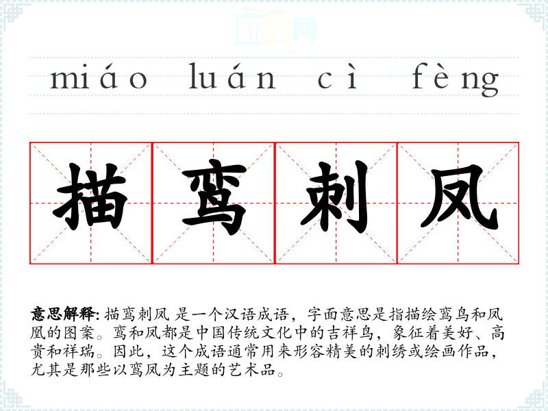 在传统文化中,鸾和凤分别代表雌雄,是吉祥和美好的象征。因此,描鸾刺凤** 这个成语不仅体现了对美的追求,也反映了古代社会对和谐与祥瑞的向往。在现代社会,这个成语仍然被用来赞美那些精美的手工艺品和艺术作品。