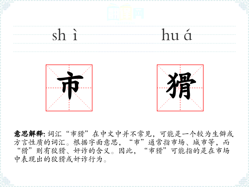 词汇“市猾”在中文中并不常见,可能是一个较为生僻或方言性质的词汇。根据字面意思,“市”通常指市场、城市等,而“猾”则有狡猾、奸诈的含义。因此,“市猾”可能指的是在市场中表现出的狡猾或奸诈行为。