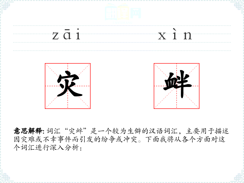 词汇“灾衅”是一个较为生僻的汉语词汇,主要用于描述因灾难或不幸**而引发的纷争或冲突。下面我将从各个方面对这个词汇进行深入分析: