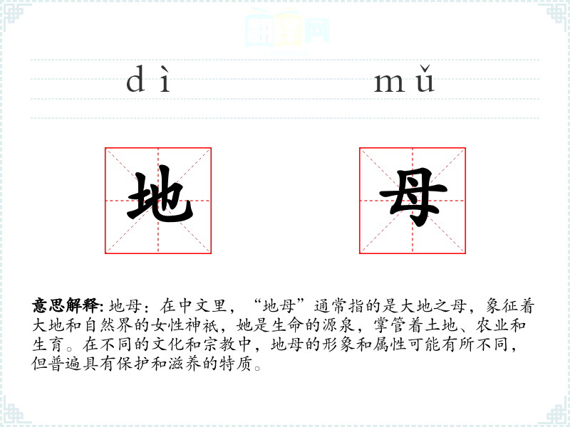 同义词:大地之母、自然女神、生育女神 反义词:天空之父、破坏者(在某些神话中,破坏者可能与地母形成对比)