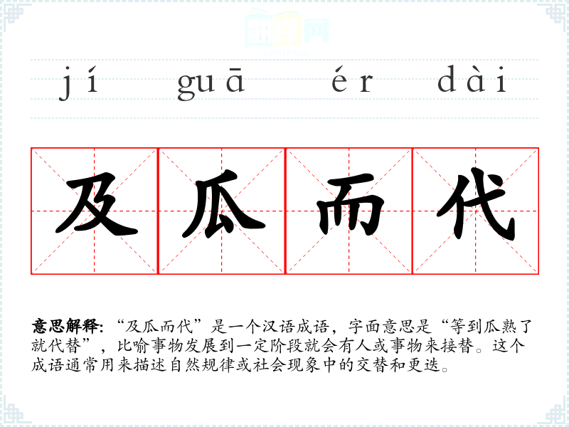 - 文学语境:在文学作品中,这个成语常用来描绘季节的更替或人事的变迁,如“春去秋来,及瓜而代”。