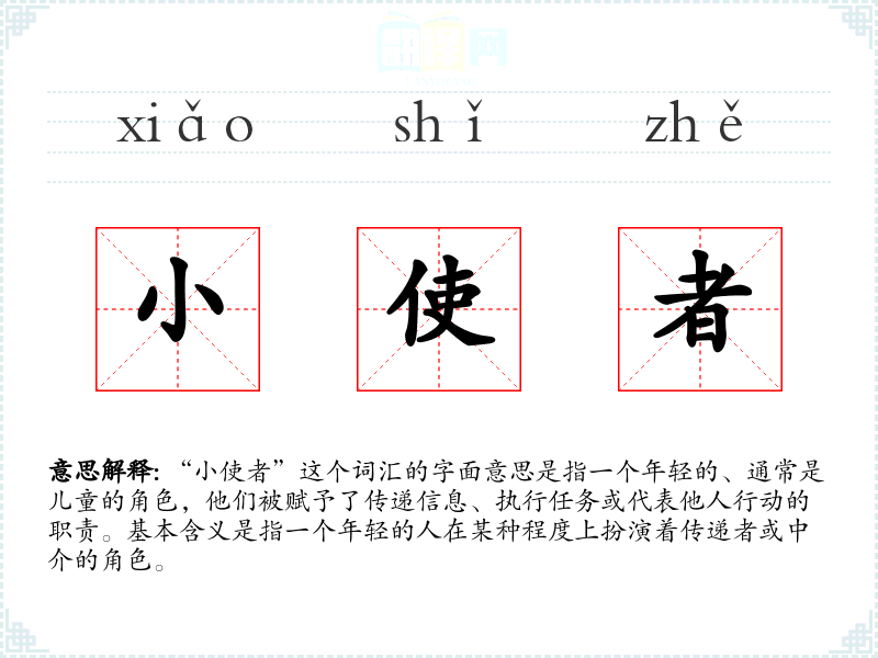 “小使者”这个词汇的字面意思是指一个年轻的、通常是儿童的角色,他们被赋予了传递信息、执行任务或代表他人行动的职责。基本含义是指一个年轻的人在某种程度上扮演着传递者或中介的角色。