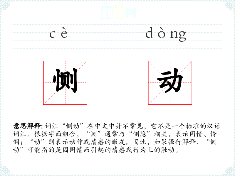 词汇“恻动”在中文中并不常见,它不是一个标准的汉语词汇。根据字面组合,“恻”通常与“恻隐”相关,表示同情、怜悯;“动”则表示动作或情感的激发。因此,如果强行解释,“恻动”可能指的是因同情而引起的情感或行为上的触动。