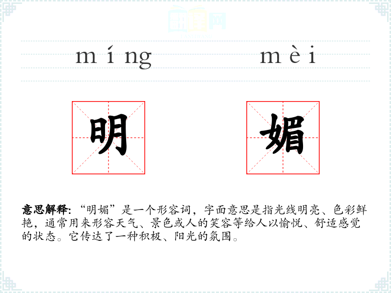 “明媚”一词由“明”和“媚”两个字组成。“明”指明亮,“媚”有美好、吸引人的意思。在古代汉语中,“媚”也常用来形容女子的美貌或姿态。随着语言的发展,“明媚”逐渐被用来形容各种给人以美好感受的事物。