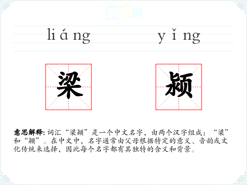 词汇“梁颍”是一个中文名字,由两个汉字组成:“梁”和“颍”。在中文中,名字通常由父母根据特定的意义、音韵或文化传统来选择,因此每个名字都有其独特的含义和背景。