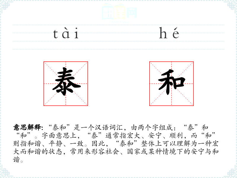 “泰和”是一个汉语词汇,由两个字组成:“泰”和“和”。字面意思上,“泰”通常指宏大、安宁、顺利,而“和”则指和谐、平静、一致。因此,“泰和”整体上可以理解为一种宏大而和谐的状态,常用来形容社会、国家或某种情境下的安宁与和谐。
