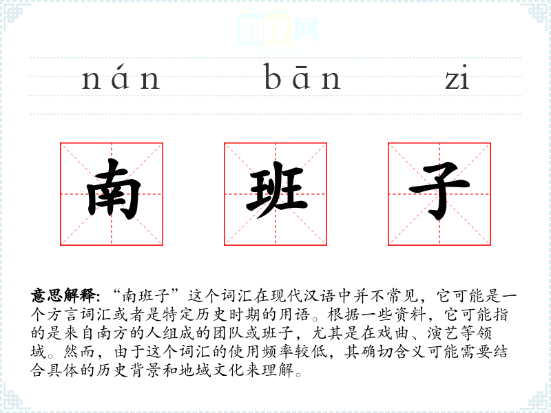 由于“南班子”不是一个常用词汇,其在不同语言或文化中的对应词汇可能较为有限。如果有对应词汇,可能需要结合具体的文化背景来理解。