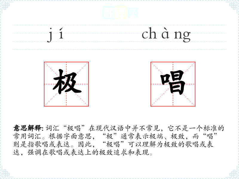 词汇“极唱”在现代汉语中并不常见,它不是一个标准的常用词汇。根据字面意思,“极”通常表示极端、极致,而“唱”则是指歌唱或表达。因此,“极唱”可以理解为极致的歌唱或表达,强调在歌唱或表达上的极致追求和表现。