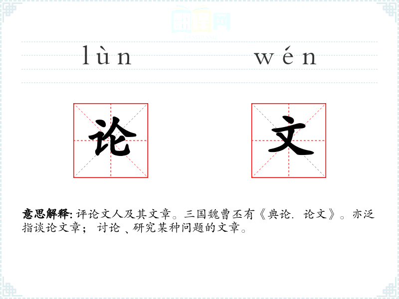 评论文人及其文章。三国魏曹丕有《典论.论文》。亦泛指谈论文章; 讨论﹑研究某种问题的文章。