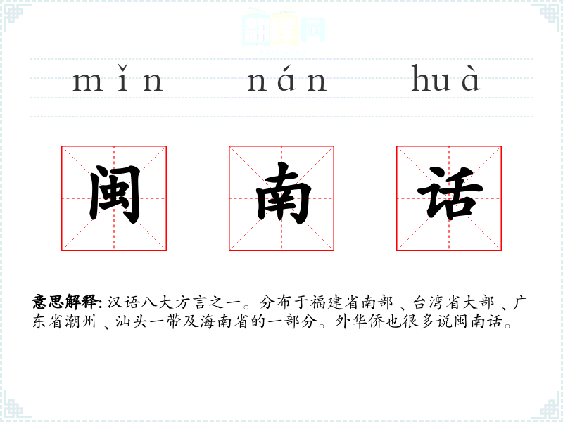 汉语八大方言之一。分布于福建省南部﹑台湾省大部﹑广东省潮州﹑汕头一带及海南省的一部分。外华侨也很多说闽南话。