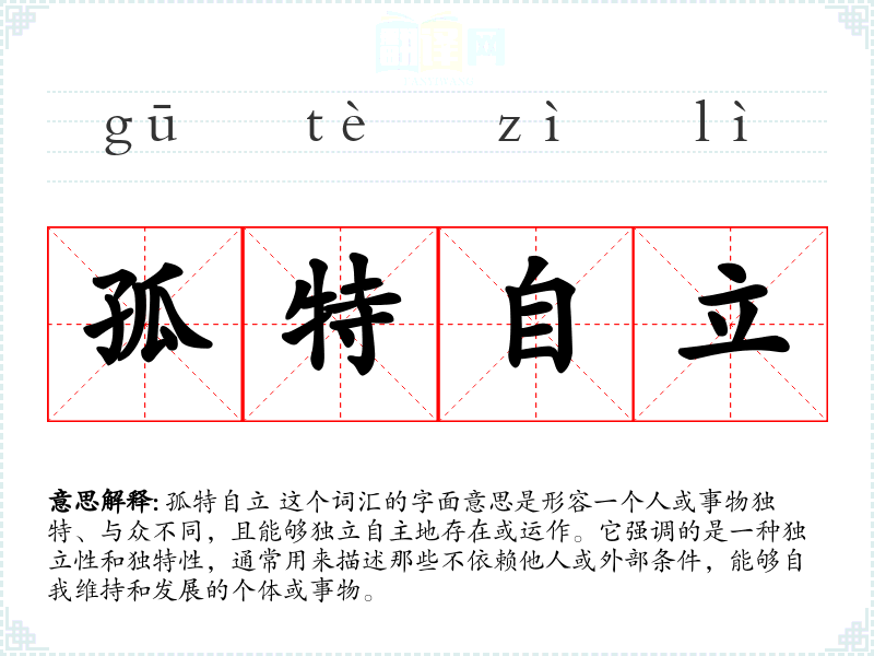 孤特自立 这个词汇的字面意思是形容一个人或事物独特、与众不同,且能够独立自主地存在或运作。它强调的是一种独立性和独特性,通常用来描述那些不依赖他人或外部条件,能够自我维持和发展的个体或事物。