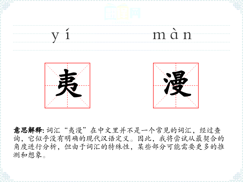 词汇“夷漫”在中文里并不是一个常见的词汇,经过查询,它似乎没有明确的现代汉语定义。因此,我将尝试从最契合的角度进行分析,但由于词汇的特殊性,某些部分可能需要更多的推测和想象。