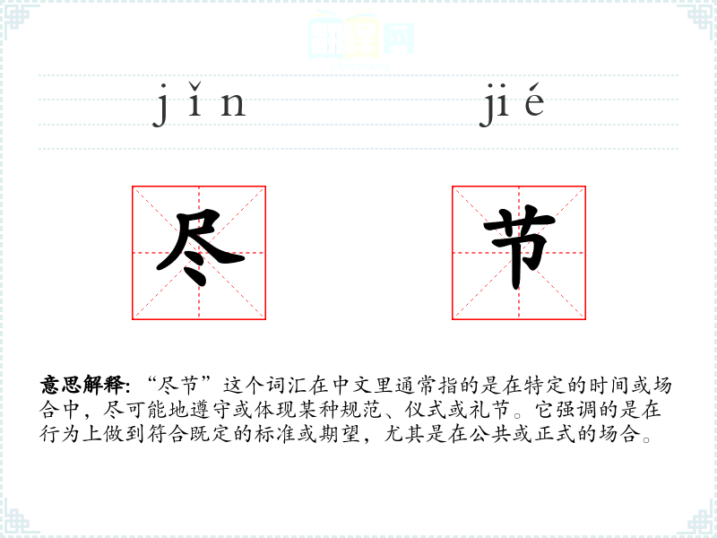 “尽节”这个词汇在中文里通常指的是在特定的时间或场合中,尽可能地遵守或体现某种规范、仪式或礼节。它强调的是在行为上做到符合既定的标准或期望,尤其是在公共或正式的场合。