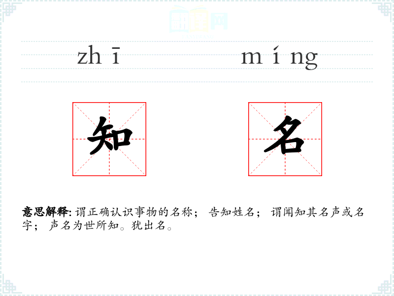 谓正确认识事物的名称; 告知姓名; 谓闻知其名声或名字; 声名为世所知。犹出名。