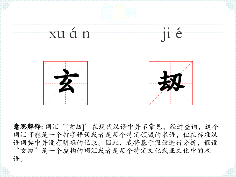 由于“玄刼”不是一个标准词汇,我们无法给出确切的基本定义。如果假设它是一个词汇,我们可以猜测它可能与“玄”(神秘、深奥)和“刼”(可能是“劫”的变体,意为灾难、困境)有关,结合起来可能指的是某种深奥的灾难或困境。