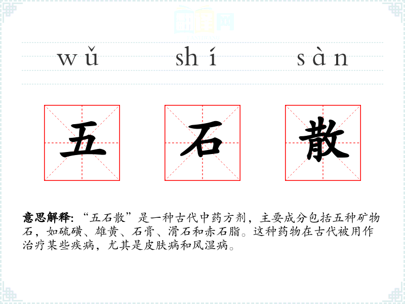 “五石散”是一种古代中药方剂,主要成分包括五种矿物石,如硫磺、雄黄、石膏、滑石和赤石脂。这种药物在古代被用作治疗某些疾病,尤其是皮肤病和风湿病。