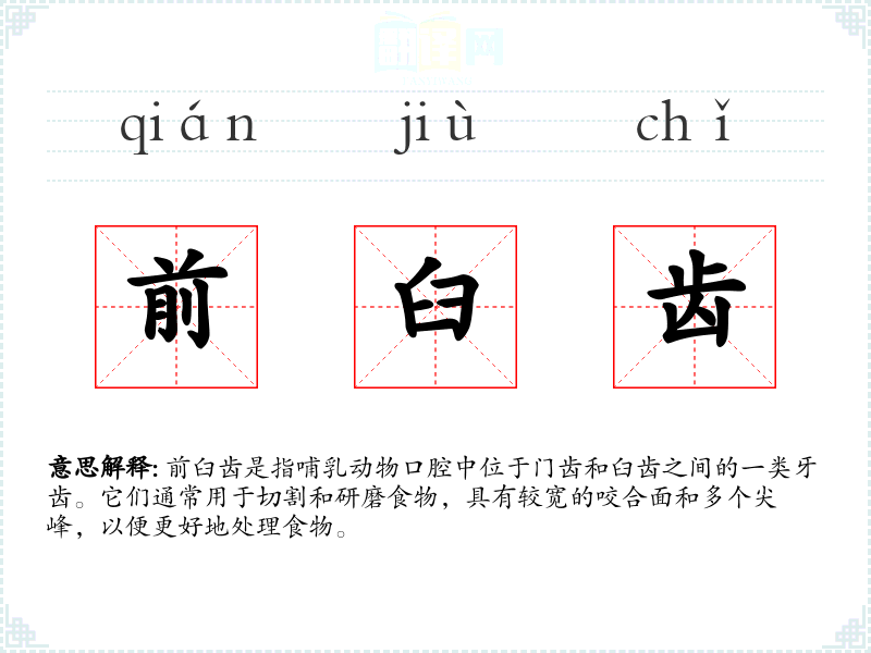 同义词:前磨牙(在某些上下文中可以互换使用) 反义词:臼齿(位于口腔后部,主要用于研磨食物)