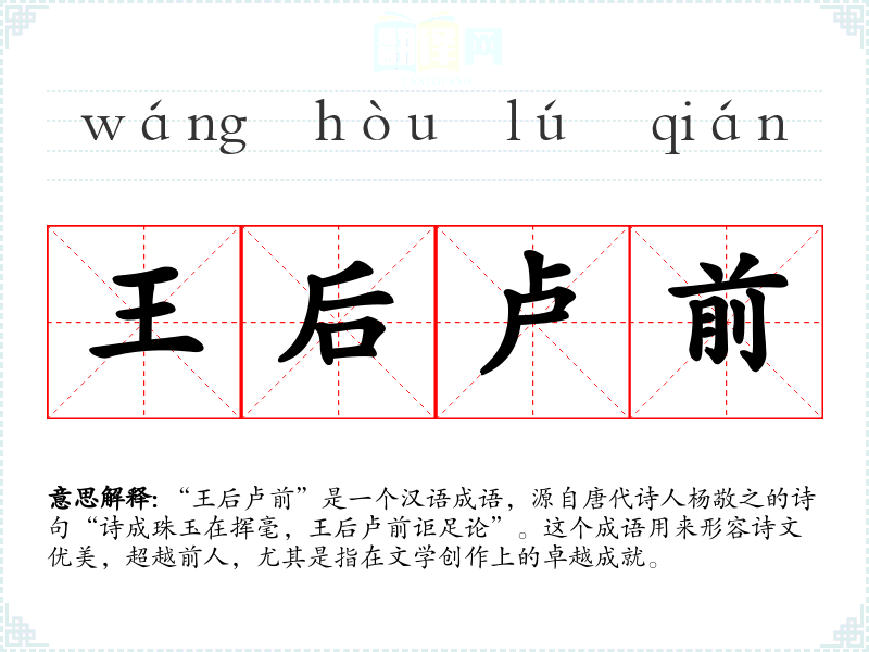 在文学语境中,“王后卢前”常用来赞扬某人的文学作品或诗作超越了前人的成就。在口语中,这个成语可能不太常用,但在文学评论和学术讨论中较为常见。