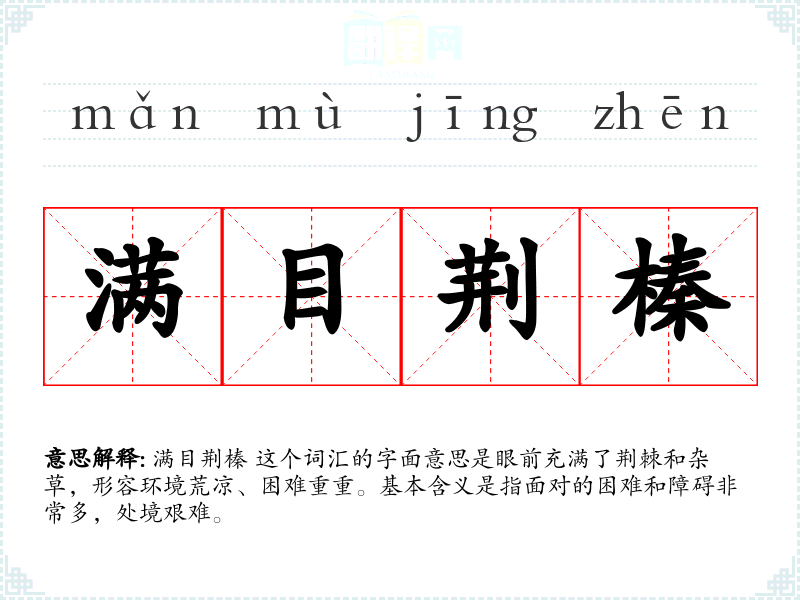 满目荆榛 这个词汇的字面意思是眼前充满了荆棘和杂草,形容环境荒凉、困难重重。基本含义是指面对的困难和障碍非常多,处境艰难。