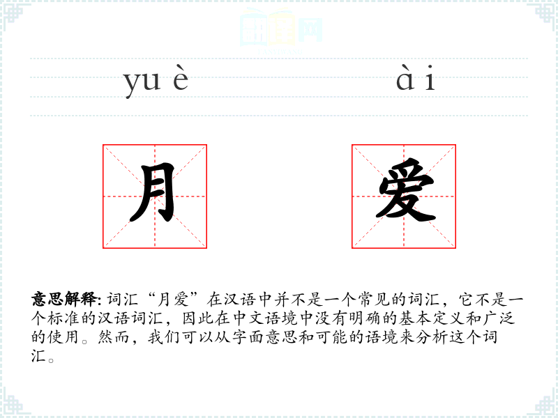 词汇“月爱”在汉语中并不是一个常见的词汇,它不是一个标准的汉语词汇,因此在中文语境中没有明确的基本定义和广泛的使用。然而,我们可以从字面意思和可能的语境来分析这个词汇。
