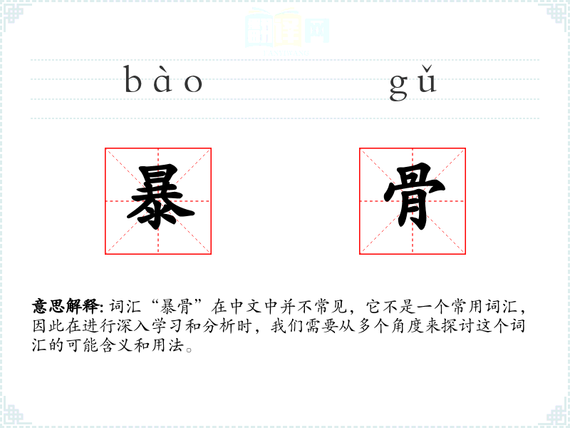 词汇“暴骨”在中文中并不常见,它不是一个常用词汇,因此在进行深入学*和分析时,我们需要从多个角度来探讨这个词汇的可能含义和用法。
