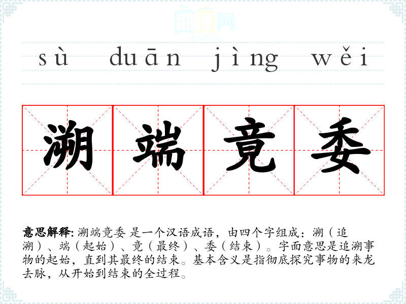 溯端竟委 是一个汉语成语,由四个字组成:溯(追溯)、端(起始)、竟(最终)、委(结束)。字面意思是追溯事物的起始,直到其最终的结束。基本含义是指彻底探究事物的来龙去脉,从开始到结束的全过程。