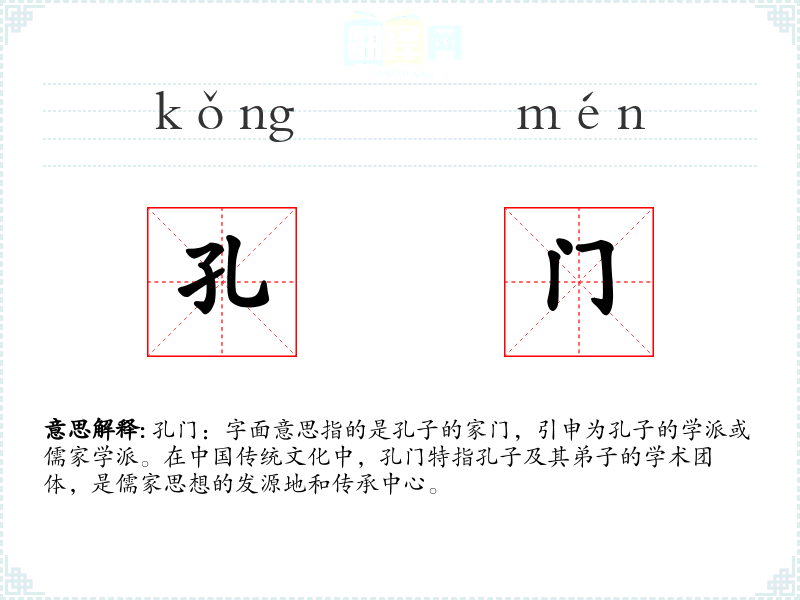 - 文学:在古典文学中,孔门常被用来象征儒家思想的权威和正统,如“孔门弟子”、“孔门学问”等。