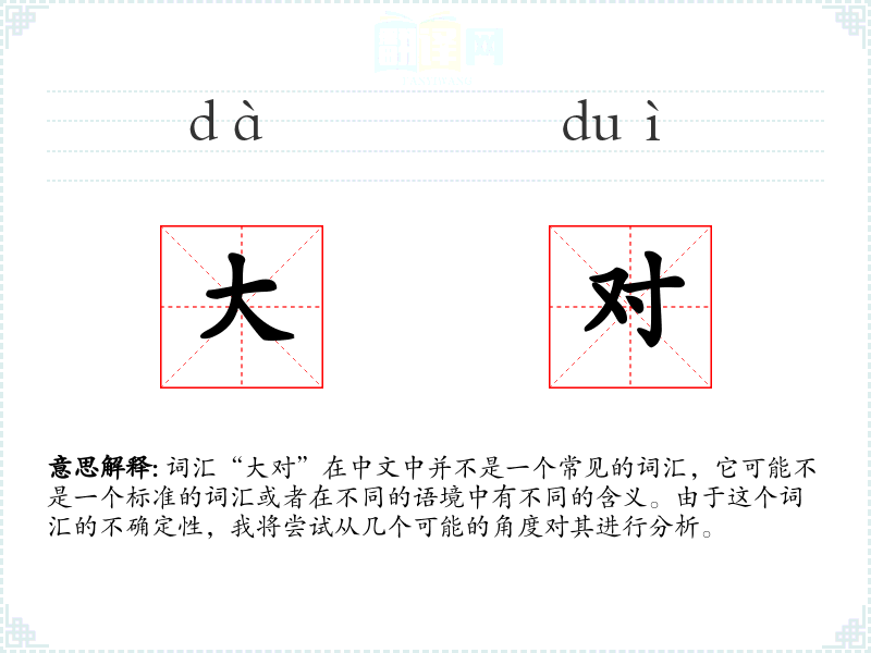 由于“大对”不是一个标准词汇,我们无法给出一个确切的字面意思和基本含义。它可能是某个方言、行业术语或者是某个特定社群中的俚语。